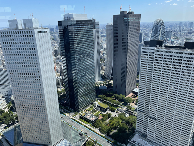 都庁第一本庁舎1階より展望室へのエレベーターにのると無料で45階の展望室に行くことが出来る。展望室からの眺望は東京が一望に出来て素晴らしい。写真は中央通りに沿った新宿駅方向で、左手より新宿住友ビル、新宿三井ビル、新宿センタービル、コクーンタワー、中央通り、京王プラザホテルになる。